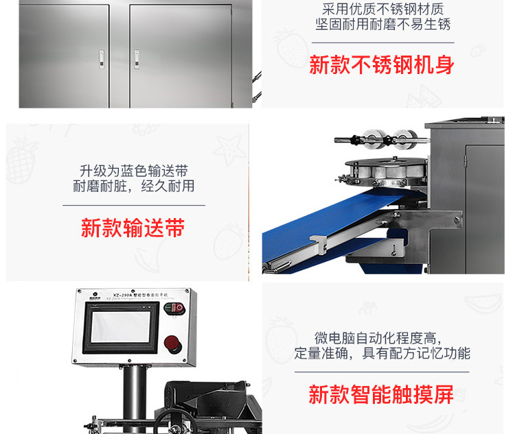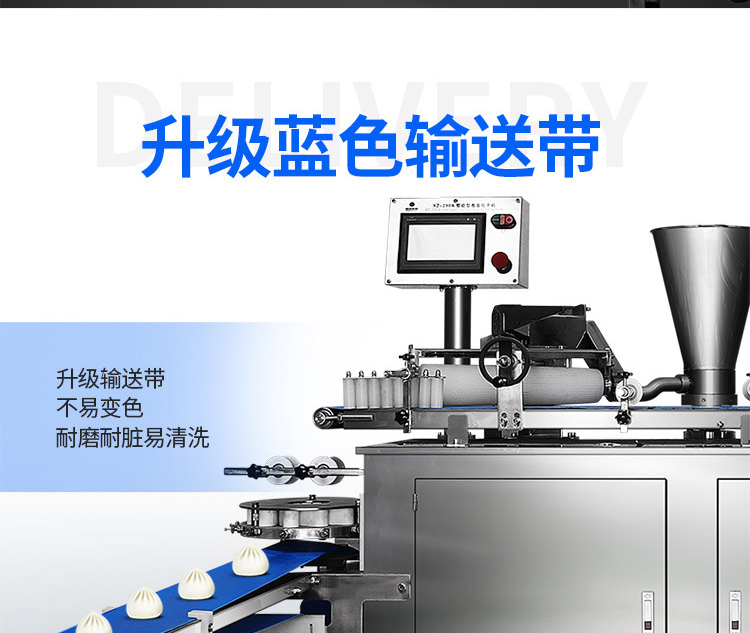 XZ-290A智能型卷面式包子機是一款以壓面方式成型面皮,卷面方式包餡,仿手工捏花的一款機型,它整合了原有的二道壓面、成型機、出餡機、切刀為一體,有操作方便、占地面積小等優(yōu)點。該機采用壓面成型面皮的方式,表面光潔,不傷面筋,不發(fā)熱,使產(chǎn)品口感滑順爽口,保持傳統(tǒng)手工工藝的風味,本機采用自動控制系統(tǒng),品質穩(wěn)定,壓面滾筒采用性能好的食品級材料UPE加工而成,且增大了滾簡直徑使得在壓面過程中面皮的精度更高,產(chǎn)品重量精度更高,規(guī)格,長度,大小,面皮的厚度皆可調整設定。