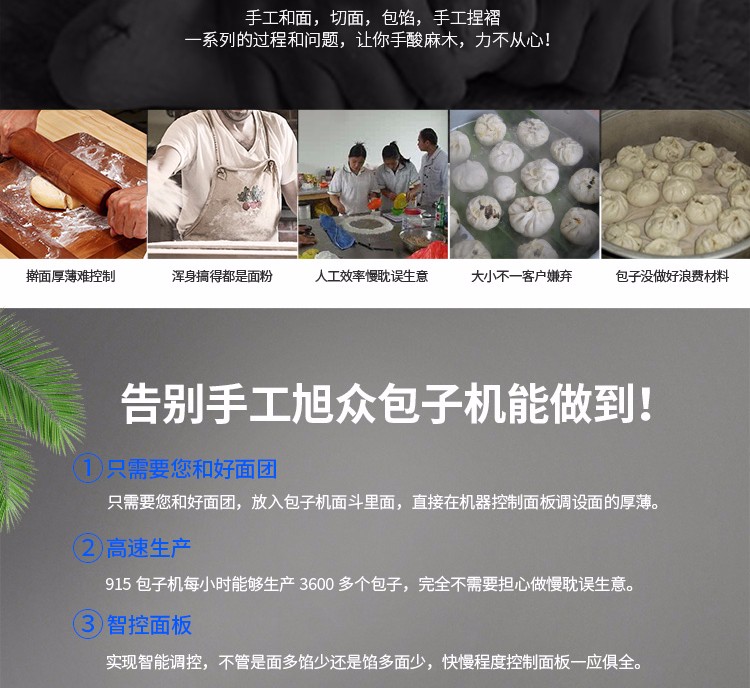 旭眾牌XZ-915全自動包子機體積小重量輕,外殼及接觸食品部分均由不銹鋼制造,外觀精美耐用;采用三變頻無極變速調(diào)控,生產(chǎn)性能穩(wěn)定。設(shè)計先進,結(jié)構(gòu)簡單,操作方便。包子機三大特色: