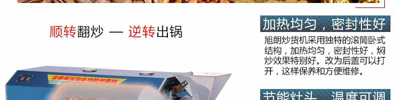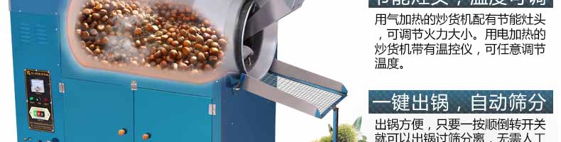 3.用氣加熱的炒貨機配有節(jié)能灶頭,可調(diào)節(jié)火力大小。用電加熱的炒貨機帶有溫控儀,可任意調(diào)節(jié)溫度。