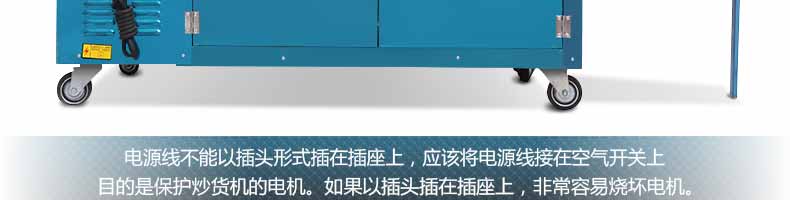 電源線不能以插頭形式插在插座上,應該將電源線接在空氣開關(guān)上,目的是保護炒貨機的電機。如果以插頭插在插座上,非常容易燒壞電機。