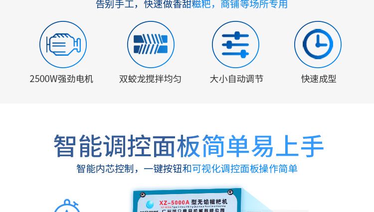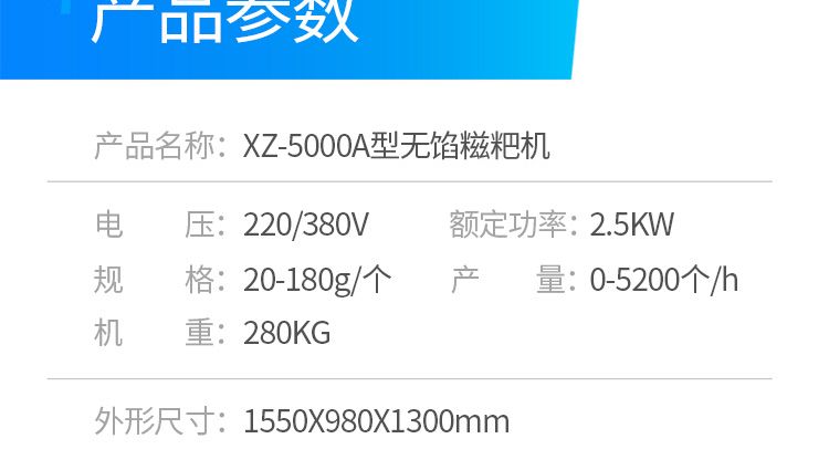 XZ-5000A型無餡糍粑機,可生產(chǎn)糯米糍粑、蛋酥糍粑、酥糖糍粑、板栗糍粑、黃豆糍粑、麥香糍粑等各種無餡糍粑制品。適用于商場、超市、酒店、影劇院、學(xué)校、圖書城、游樂園、旅游景點等各種場所。免費提供工藝技術(shù)。免費上門培訓(xùn)指導(dǎo)安裝。