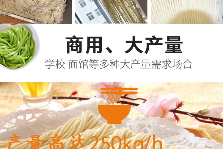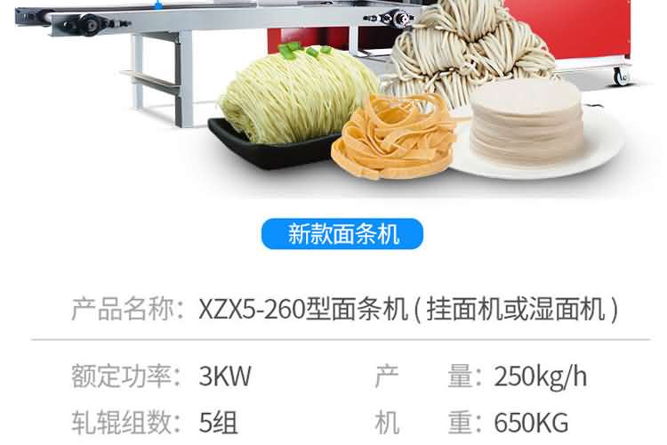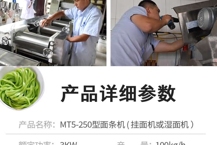 MT5-250面條機(jī) (掛面機(jī)或濕面機(jī)) | 外形尺寸:2300×600×1400mm 產(chǎn)量:200kg/h 軋輥:98×260mm 功率:3kw 軋輥組數(shù):5組 機(jī)重:450kg | 鐵外殼 |