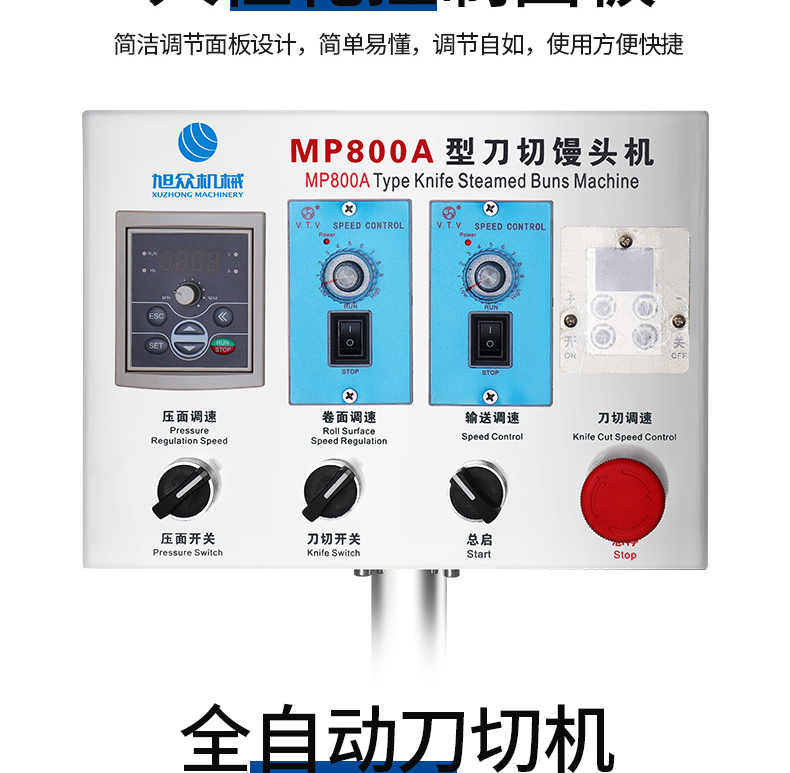 旭眾MP800A型刀切饅頭機采用高品質(zhì)微電腦控制,人性化的控制面板,控制準確可靠,操作簡單,可生產(chǎn)各種刀切饅頭、花卷等面食產(chǎn)品。