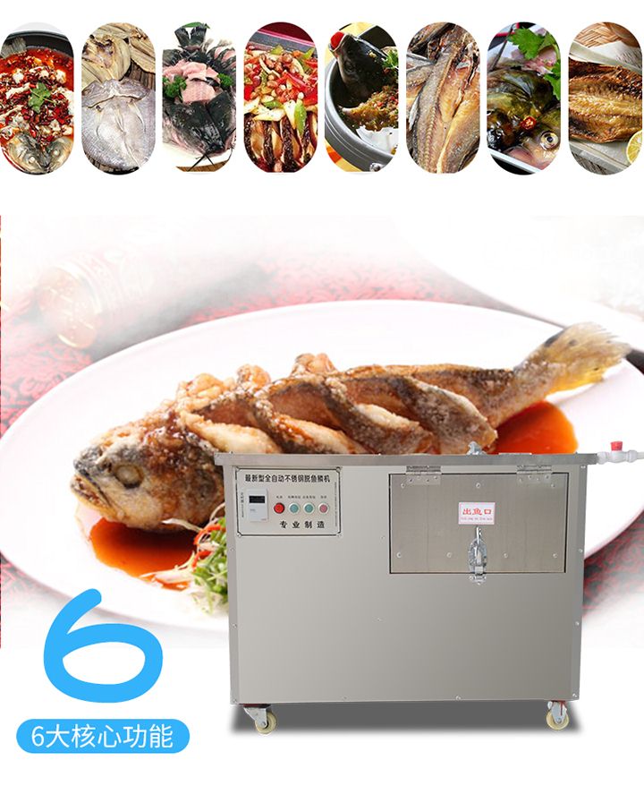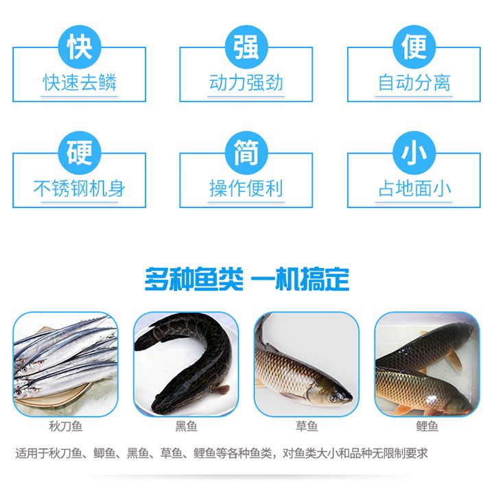 自動魚鱗機廣泛應(yīng)用于魚類銷售市場、飯店、魚類加工廠等等,本產(chǎn)品不會對魚頭、魚尾、魚鰭造成損傷。該機器利用旋轉(zhuǎn)效應(yīng),使魚在運動中去鱗,去鱗干凈,對魚的加工去鱗屬國內(nèi)外首創(chuàng),主要指標達到國際先進水平。