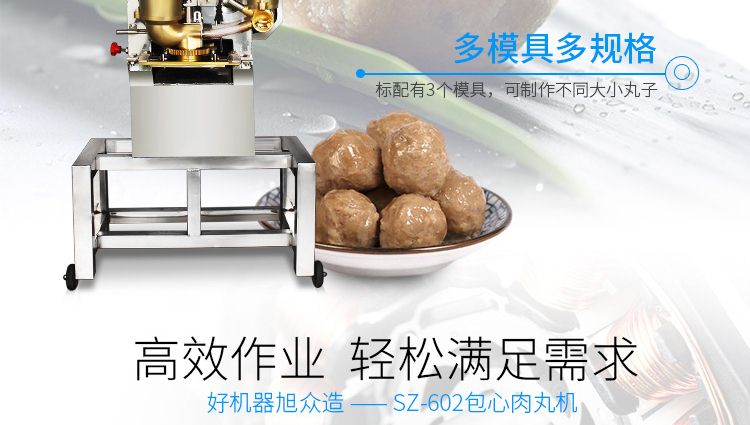SZ-602包心肉丸機(jī),可生產(chǎn)包心魚丸、包心豬肉丸、撒尿牛肉丸、爆汁小魚丸等多種球形醬湯類包餡產(chǎn)品。操控性強(qiáng)、穩(wěn)定性高、出品率穩(wěn)定;可抽皮增餡,做到皮薄餡多。