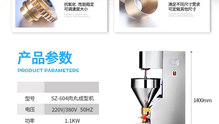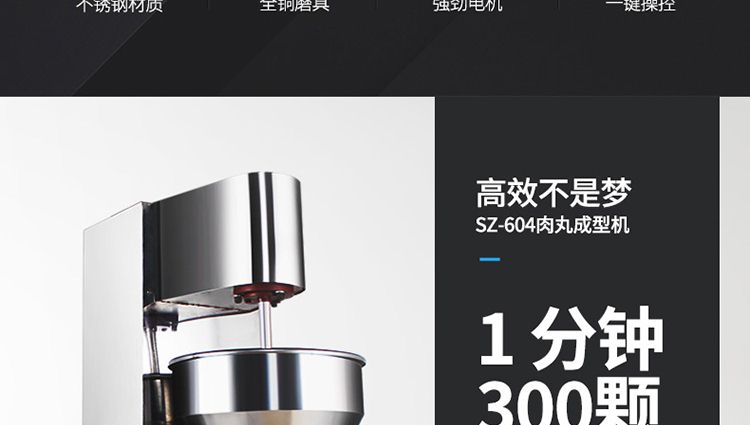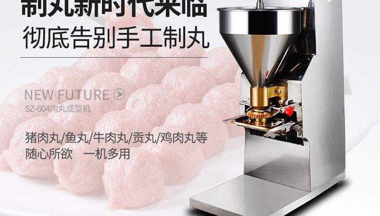 SZ-604肉丸成型機(jī),肉丸成型機(jī)采用不銹鋼材質(zhì),丸子直徑可達(dá)15-35mm,可以制作各類爽脆,有韌性、有彈性的豬肉丸、魚(yú)丸、牛肉丸、貢丸、雞肉丸等