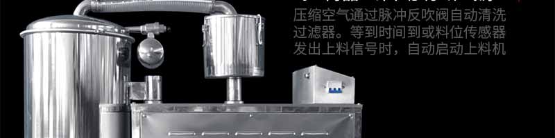 真空上料機由真空泵(無油、無水)、不銹鋼吸料咀、輸送軟管、PE過濾器(或316L不銹鋼過濾器)、壓縮空氣反吹裝置、氣動放料門裝置、真空料斗和料位自動控制裝置等組成,整套系統(tǒng)設計合理、制造精美。