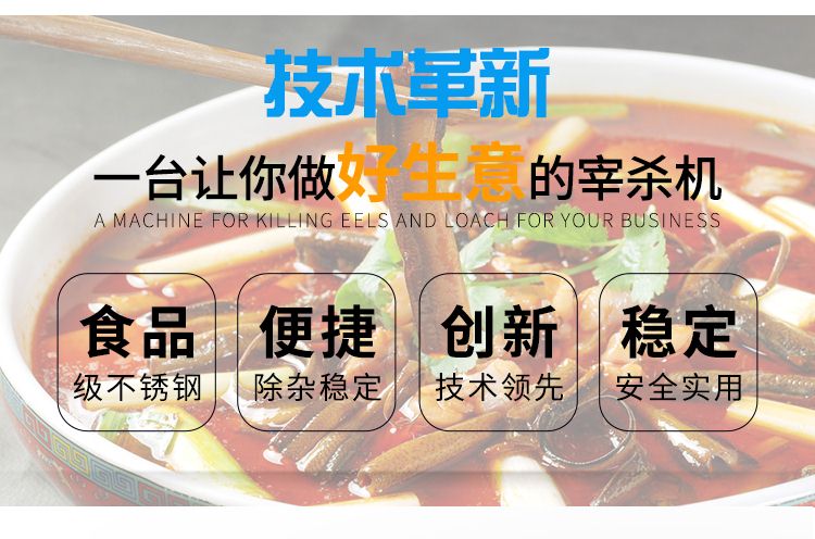 鱔魚泥鰍宰殺機是我廠根據市場需求,自行研發(fā)設計的,專業(yè)宰殺鱔魚、泥鰍的通用型機電設備,具有工作效率高,能耗低,故障率低,經久耐用,操作安全方便,外形美觀大方等特點。填補了市面上黃鱔泥鰍宰殺設備的空白,是一款不錯的投資產品,可廣泛應用于菜市場、食堂、食品加工廠、酒店等場所。