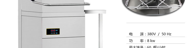 旭眾牌XZ-60揭蓋式洗碗機板材采用標1.2mm厚不銹鋼板,主骨架均為國標1.5不銹鋼管,底座鋼板為6mm,進出口傳動軸均為304#不銹鋼材質(zhì);水泵為意大利進口水泵(國標15米揚程)不銹鋼食品泵,電器采用知名品牌正泰電器,篩網(wǎng)為激光沖孔。揭蓋式洗碗機主要針對小碗、小碟、杯子類餐具。