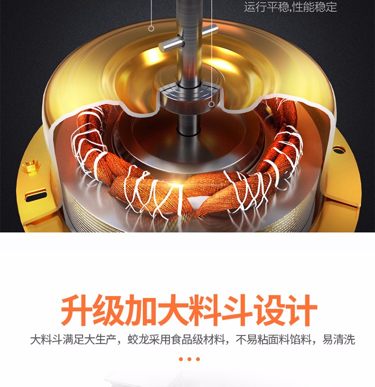 5.料斗加大,蛟龍采用高品質(zhì)食品級PP材料,不粘面料、餡料,易清洗;