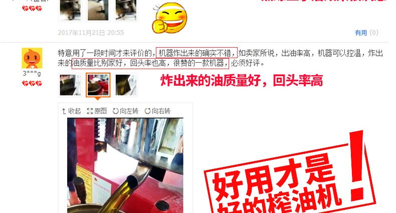 重要提示:離心濾油機建議配XZ-LL100(離心濾油機需要加鹽水濾油,該機通過高速旋轉(zhuǎn)產(chǎn)生離心力,使比重不同的液體與固體自動分離,從而達到油渣分離。),正壓濾油機建議配XZ-ZL2(正壓濾油是與空氣壓縮機組合,如果給客戶配正壓濾油機需要買個空壓機。正壓濾油油桶內(nèi)的毛油處于密閉狀態(tài)時,壓縮空氣送入桶內(nèi)形成一定壓力,使其強行通過濾布。)榨油機如有榨較硬的物料如山茶籽一定要用518以上而且是-2的設(shè)備(客戶榨山茶籽和硬物料推薦用-2設(shè)備,如果榨花生菜籽等高油較軟的物料請推薦-4設(shè)備)。