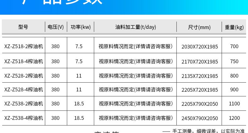 備注 | 每小時產(chǎn)量550斤物料(根據(jù)物料不一樣產(chǎn)量也不一樣),輔助設(shè)備配離心濾油機或正壓雙桶濾油機(需選配空壓機)、炒貨機配XZ-C250或XZ-CD300 |